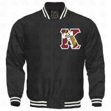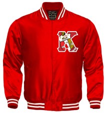 Satin baseball jacket with an embroidered organization shield on a 5" tall double outlined organization letter.
