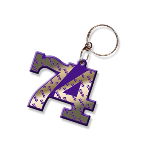 Acrylic double-digit line number keychain with organization Greek letters printed across.