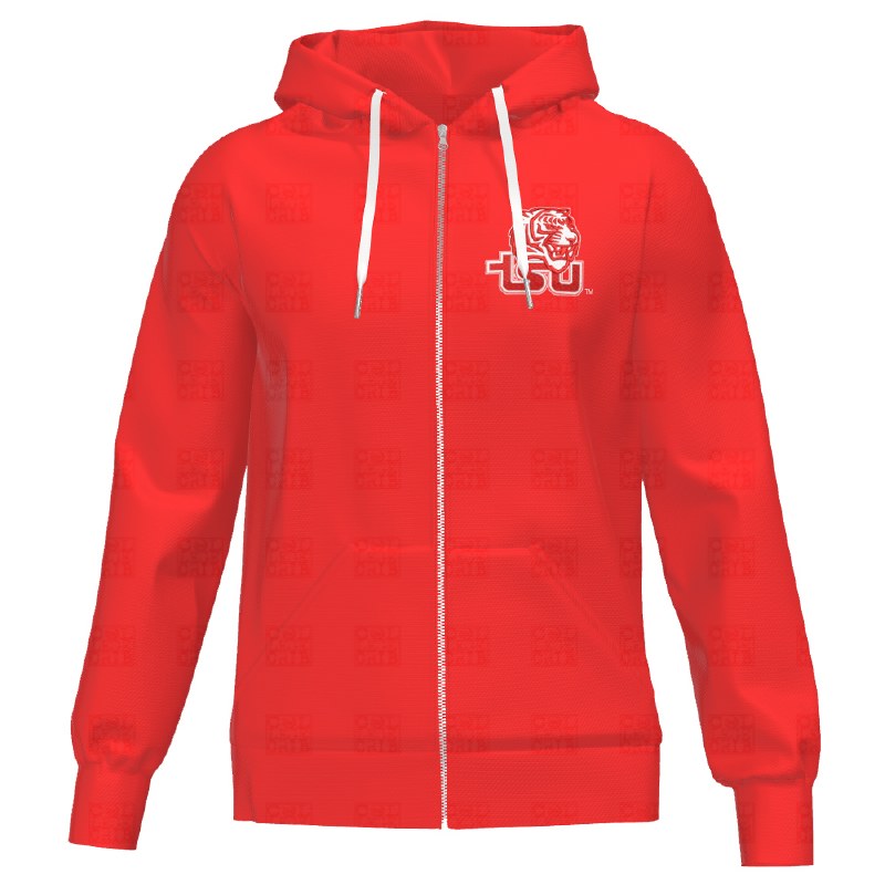 Cool solid color fleece zip-up hoodie with fully embroidered Tennessee State University Sports team logo on the left chest.